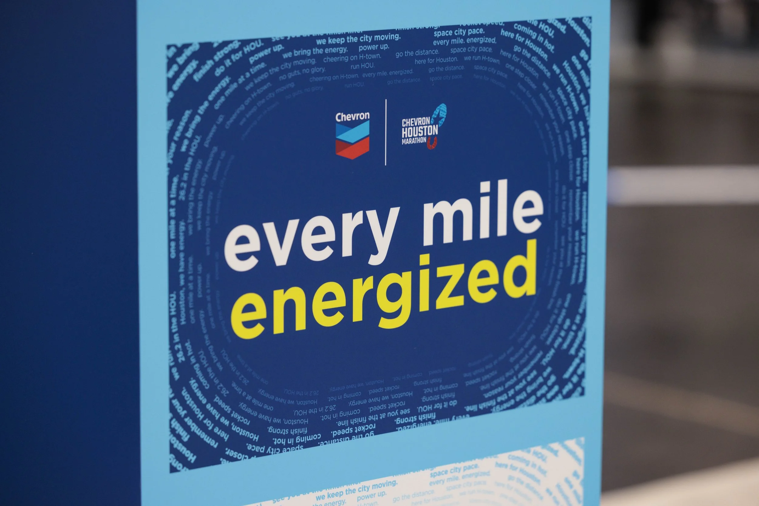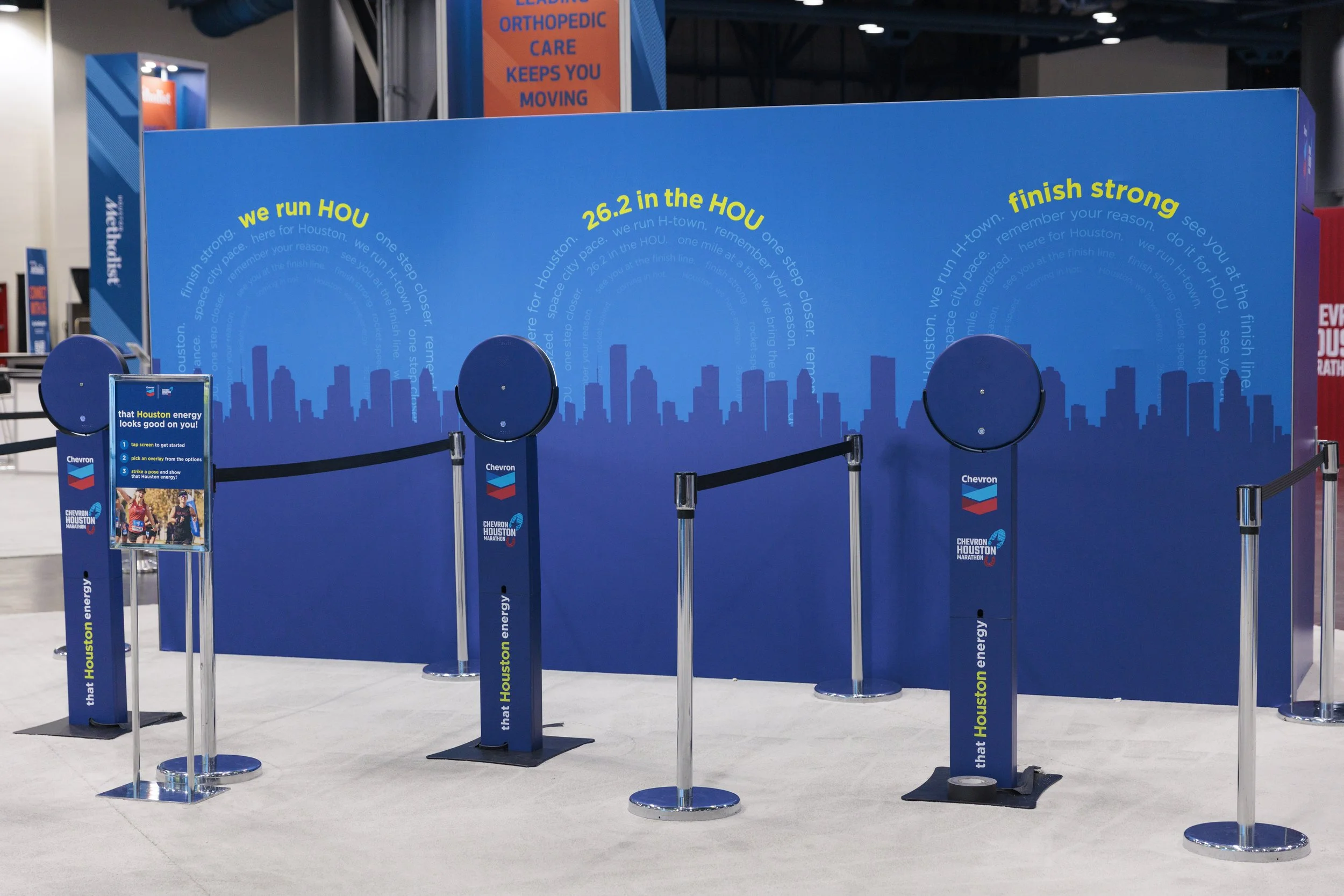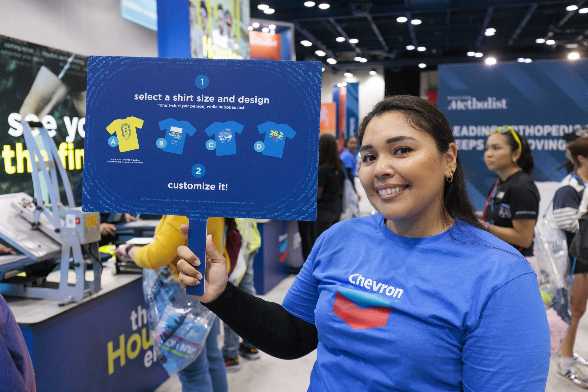 At the expo, the experience extended beyond environmental graphics through interactive moments and branded takeaways. We designed custom Chevron T-shirts that were printed on-site, alongside a suite of branded freebies that reinforced Chevron’s presence and extended the marathon experience beyond race weekend.